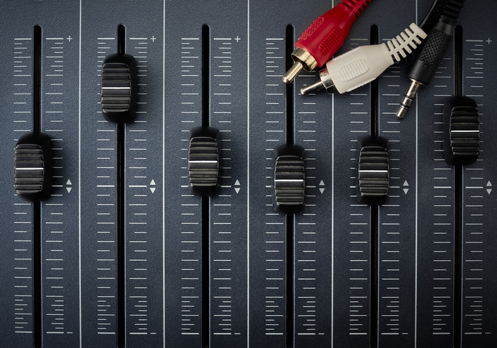 audio cables with rca connectors on faders of a mixer for audio production