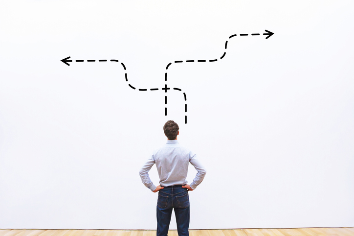 business strategy or decision making concept, pensive businessman choosing direction