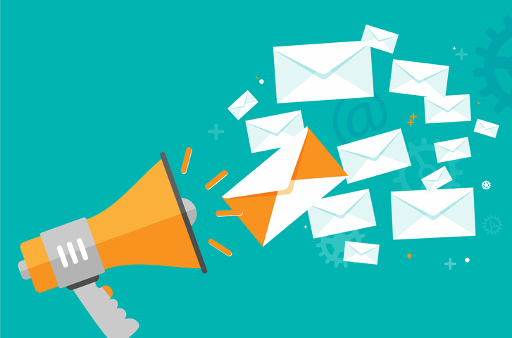 Megaphone icon in flat design and flying mail envelopes – info or newsletter concept. Vector illustration.